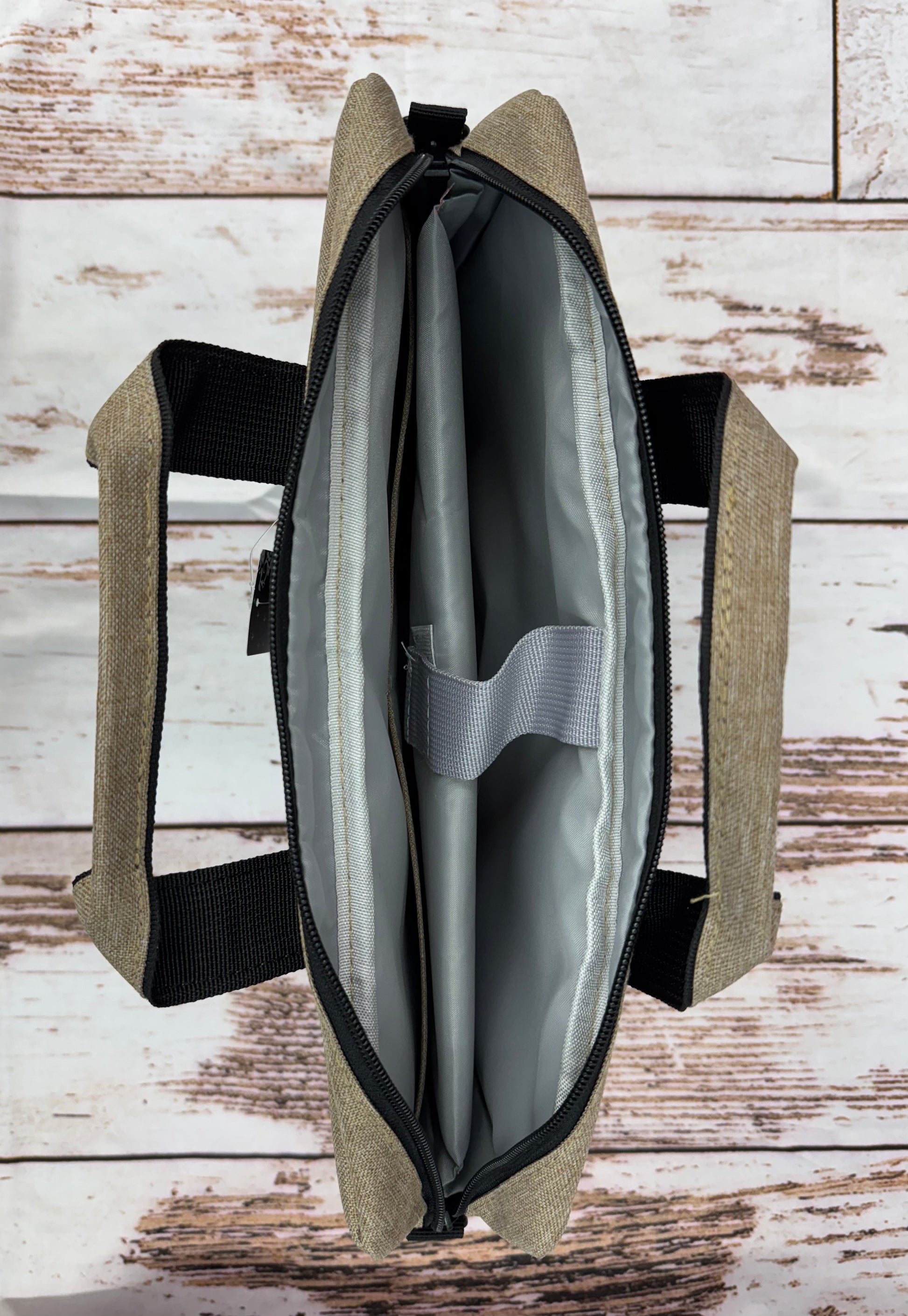 Native print on the front, comes with a shoulder strap. Two main zipper pockets, main pocket has divider thick n will protect computer as well has 2 small pockets within. Second zipper pocket has 2 pockets within. Outer shell 100% Polyester Lining 100% Polyester. 16x14 Depth 2 Inch