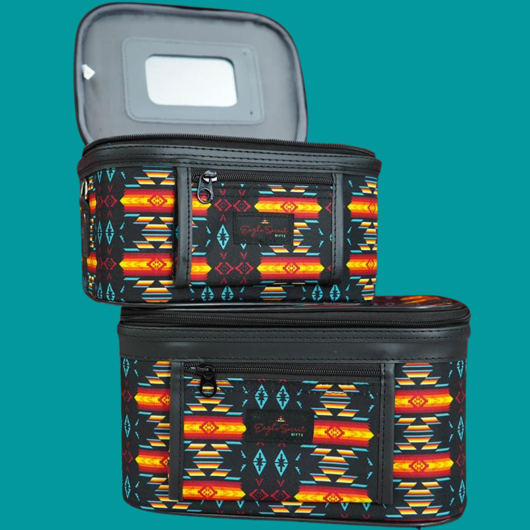 The cosmetic set contains a larger and smaller cosmetic case. The cases include a mirror on the inside, and an adjustable strap.